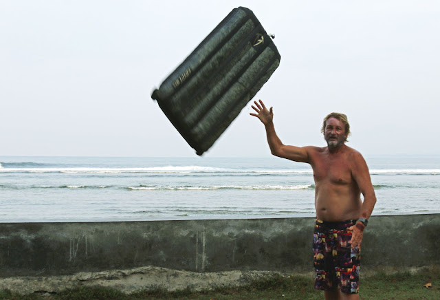 Okay, I was having a full meltdown on the beach, the heat and humidity was near unbearable, and I was hanging to jump into the water to cool down and catch some of the bomb waves that I was filming, anyways I left my only pair of sunnies behind up the beach, and had walked back down not realizing where I had left them, so between the camera not playing ball, the heat and now no sun glasses', I was fully spinning out and marching up and down looking to see where my glasses were….then this young Aussie surfer pulls up on a motorbike and we start talking , ‘ how come there is nobody else out ? ‘ , I just shrug my shoulders, dont know ‘ was my reply. He then asks what are those guys riding? ‘surf mats ‘ I answered. Why he asked ? ‘ cause we can ‘ was my reply, which brought a grin to his face and the next question was ‘ can I take a picture of you ‘? I had forgotten that I was wearing my Shazam board shorts, a equally colorful Hawaiian shirt and a funny little hat with camera and tripod in hand , no wonder the guy was laughing, but he did speak fluent Indonesian, so after explaining my lost sun glasses predicament , he offered to speak to the local kids who had all just appeared on the beach, so with the lure of money, these little kids went bolting down the beach with the chance to earn some money, and this coincided with poor old Phil getting out of the water , such a funny sight watching these kids running past right past Phil, who he thought they were coming down to help him.I did get out for a few waves, by now the tide was filling it up and the wind more side shore, but only caught a few before Paul called me in, he had wrenched is shoulder trying to hold onto his mat, so we packed it in for the day before anyone else got hurt. Watch below for the vision from land and from my go pro camera