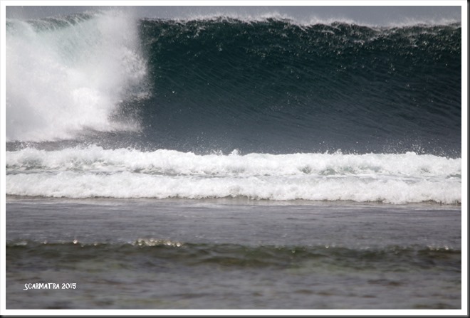 After arriving the previous afternoon I skipped lunch and went straight out for a surf while everyone else was having a feed. It was only a couple a couple of feet but it gave me a chance to feel the reef out with only a handful of guys out. The next morning the swell was slightly larger but so was the crowd, so by midday a new swell had started to kick in and with nobody else out I thought it was time to try my spoon out….big mistake! By the time I had walked up and where I had to jump off the edge of the reef I knew it was a stupid move in going out on a spoon, but with the only advantage that I can sink and duck dive the sets with ease, so I was in the line up in no time and the swell was increasing and sweeping down the reef with the incoming tide. The winds were more cross shore, in fact we never had a day with true offshore trade winds blowing the whole time we were there, but after trying to catch 2 smaller waves and getting mowed down before I could even get to my knees, I had to ride one prone, with the other one breaking over my back even though I was kneeling. Now I never use a leash or legrope when riding my spoon, the zero floatation means your board will normally pop up near you if you do loose it , well standing in waste deep water and seeing my spoon just laying a few feet away , I turned my back to the ocean and went to swim toward my board only to get pounded from behind by 6 feet of foam and was pushed face first into the reef…..all I heard was crack as my face impacted and lucky enough I took the brunt of the blow with my forehead, but it still broke and split my nose right on the bridge and some how ripped the top of my left hand, so I was luckey enough not to be knocked out and was able to recover my spoon, which now has a nice little scar running down the bottom, and make my way back to shore, much to the laughter of my fellow travellers ……little did they know what was in store for them in the following 2 weeks.Yes , a bit hard to kick into a wave on a spoon